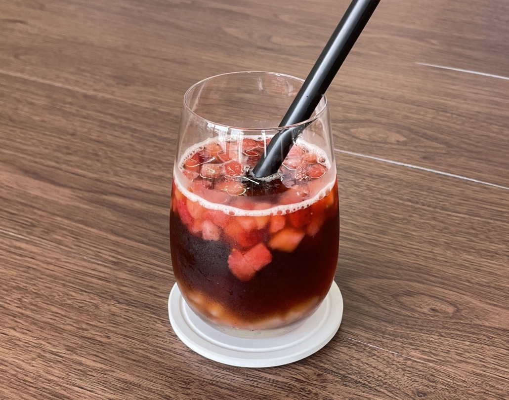 Fruit Tea Strawberry & Nata de Coco ×Black Tea 650yen (tax included) A sweet black tea-based iced fruit tea where you can enjoy the texture of plenty of strawberries and nata de coco.