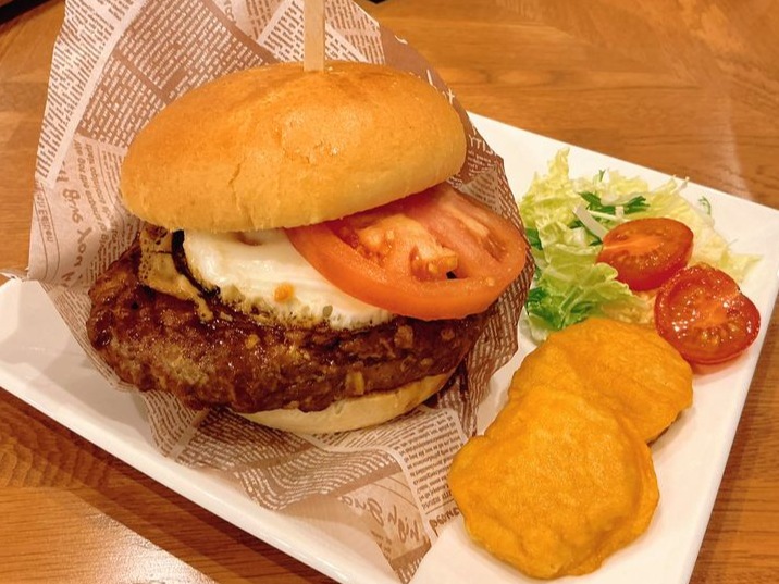 A hearty hamburger(teriyaki)made with soybean meat.