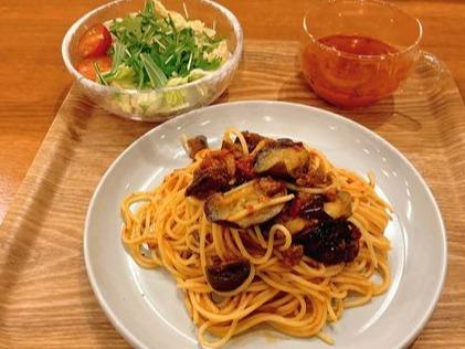 ジューシーに揚げた大きな“なす”と、甘辛い味付けの“ひき肉”が食欲をそそるスパゲティ。