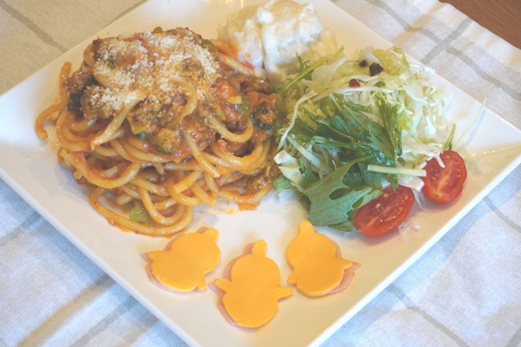 LOVOTのシルエットが可愛いパスタプレート。トマト感たっぷりのソースが自慢です。