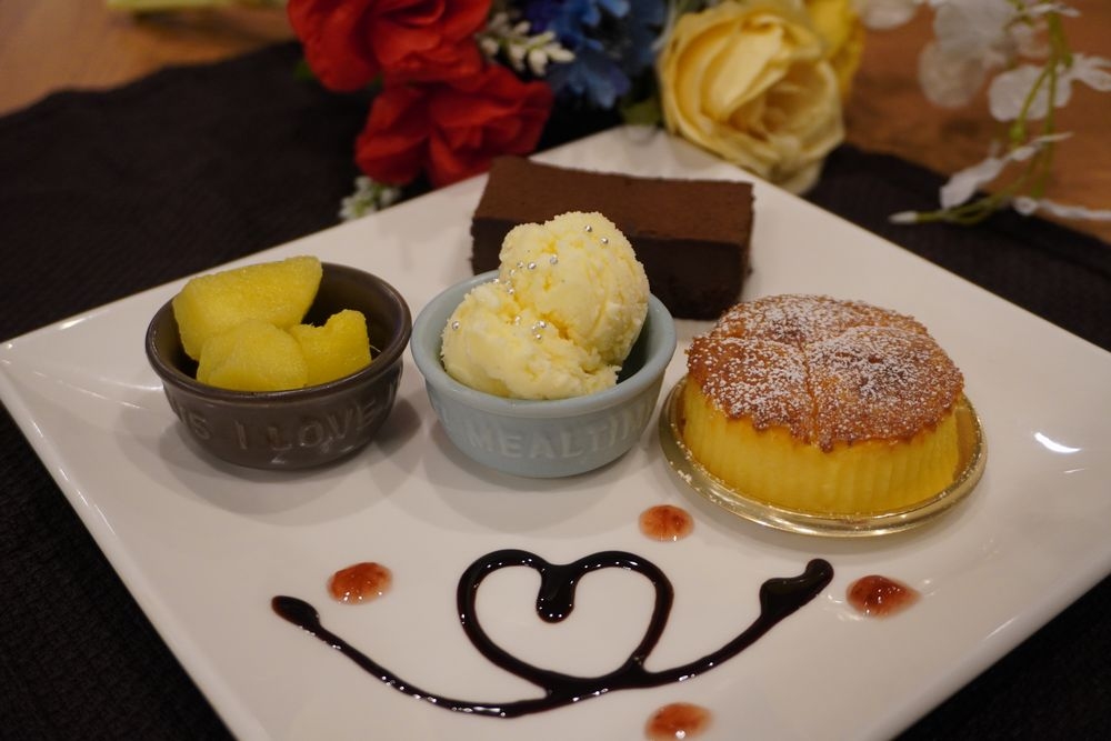 ケーキ2種・アイスクリーム・フルーツを盛り合わせたデザートプレート。